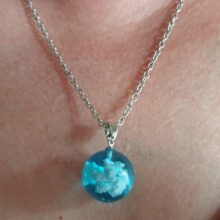 My daughter saw this necklace on Pinterest and asked for it for her birthday. It seems a little delicate but it is a unique piece of jewelry. It looks like a tiny crystal ball filled with air with a poof of clouds. It feels pretty solid for the size. My only concern would be to pendent to chain connection.