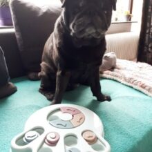 I love my dog more than life itself. He’s a rescue so not sure of his age. We think 15 (going on 3). Bought this puzzle hoping he would have fun and use it. Had no clue how fast he took to it. He’s not the most ‘intelligent’ so I wondered but he got the treats so fast. He hasn’t used his paws yet to move the pieces around, just uses his nose, but he’s doing it. Everytime he gets one I cheer for him and his tail wags like crazy and he continues on. He love his puzzle. I can’t wait to get him more so that he will get that brain going when I’m at work during the day (even though he’d probably play with it before I am even out of the driveway)