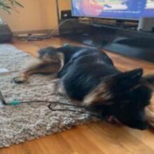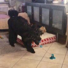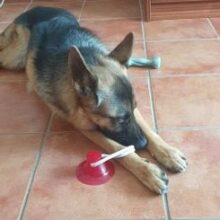 Absolutely hilarious toy! Our 1yr old GSD/Boxer mix is obsessed with it, put it on any flat surface and he'll try to get it off. If you have a larger breed or smart dog, keep an eye on them! They'll figure a way to get the toy off!